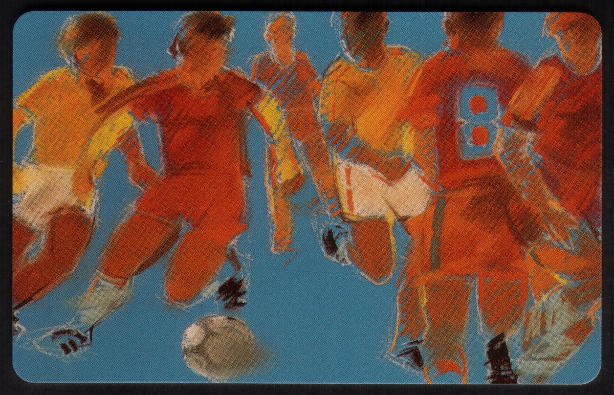 This collectible card features artwork by LeRoy Neiman, renowned for his vibrant and energetic painting style. The card’s design highlights a dynamic soccer theme, showcasing an abstract, expressive representation of the sport through vivid watercolor and drawing techniques. The image captures the intensity and motion of a soccer player in mid-action, with fluid brushstrokes and colorful splashes that emphasize movement and passion associated with futbol or fotboll.
