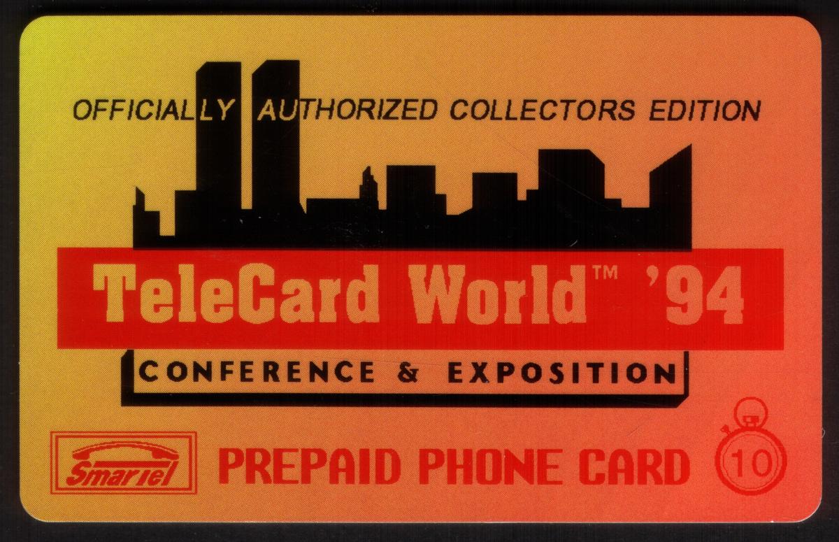 The card is associated with the 1994 TeleCard World Conference & Exposition, a notable event related to phone card collectors and enthusiasts. The text on the card includes "TeleCard World '94 Conference & Exposition (Collectors Edition)" along with the word "SmarTel Communication." The value indicated on the card is 10 units, confirming its function as a phone card used during that period. The card highlights the theme of events, expos, and shows, particularly emphasizing its connection to telecommunication events in 1994.