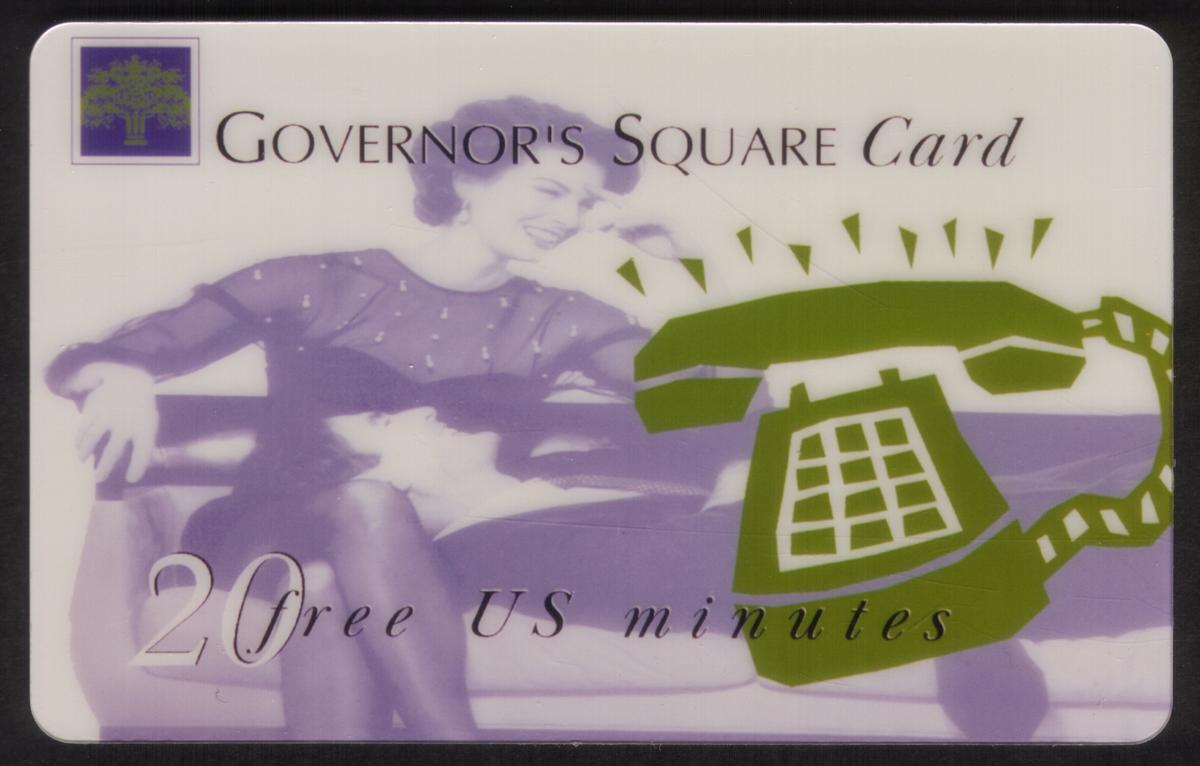 This collectible stored value smart card is titled "Governor's Square Card" and is associated with Governor's Square Mall located in Tallahassee, Florida. The card is designed for use with telephones on phonecards, providing 20 free US minutes of call time. The card features a predominantly purple and green color scheme with an illustrated vintage rotary-style telephone in green on the right side.