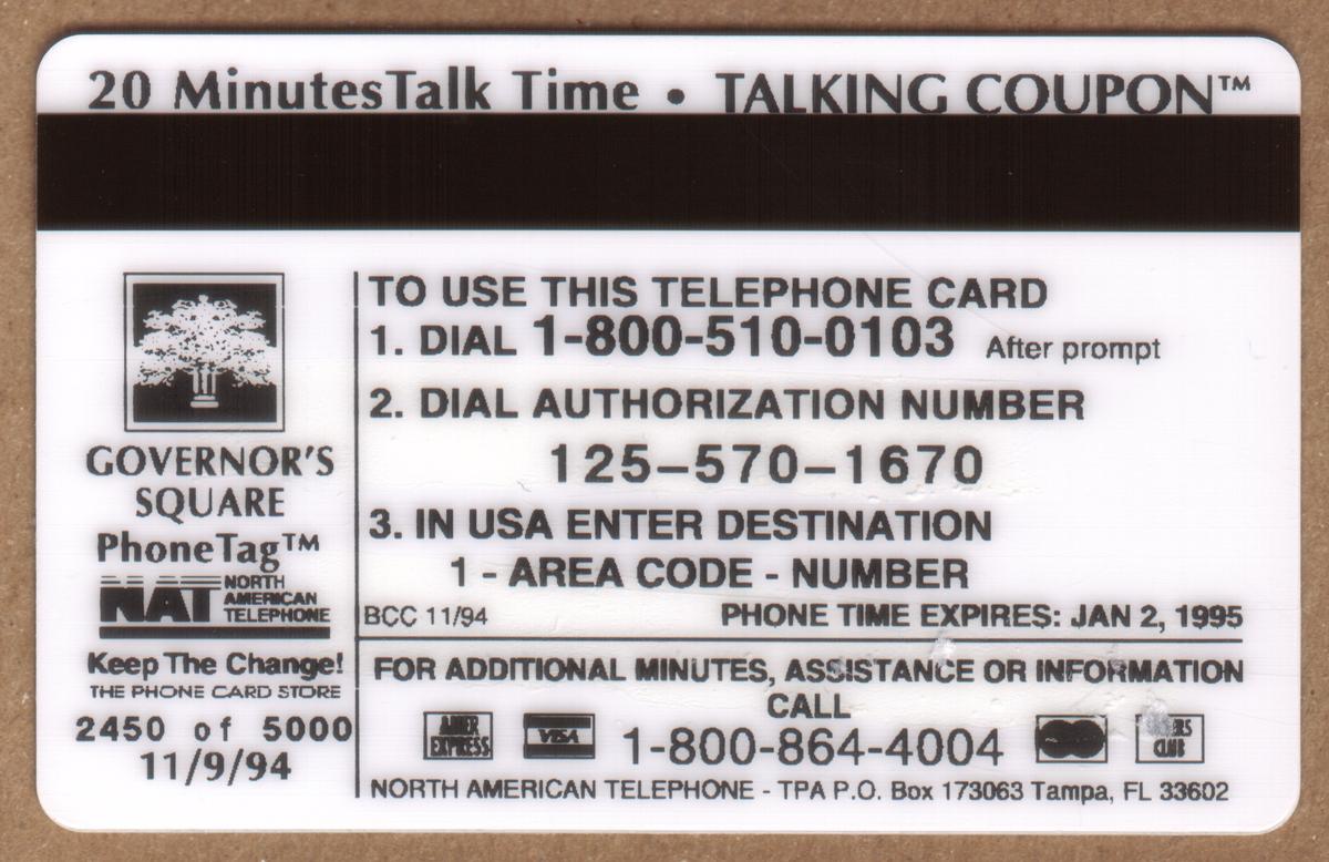 This card is a mag stripe stored value smart card issued by North American Tel., used as a promotional giveaway for shopping centers and malls, specifically highlighting the Governor's Square Mall in Tallahassee. It is intended as a user card for telephone calls, combining both a collectible and functional aspect.