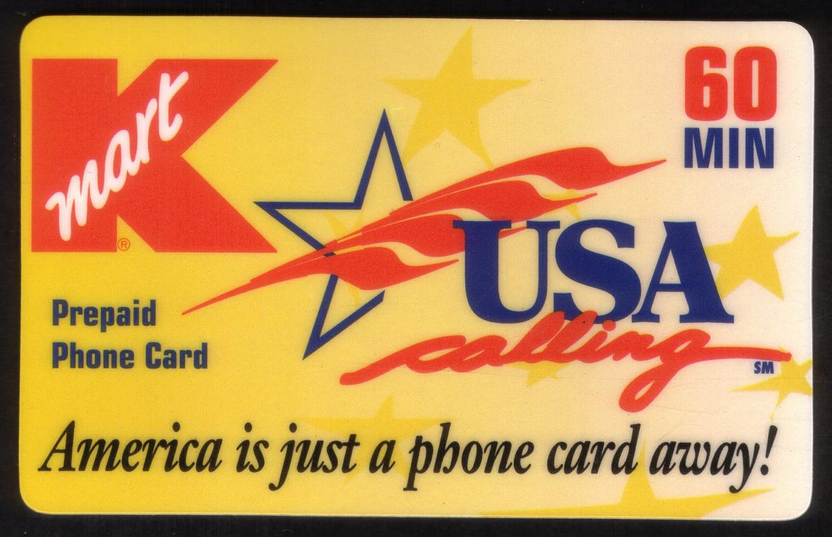 The card is issued by WorldCom, as indicated by the WorldCom logo in the lower right corner. The design and text emphasize the ease of making calls to the USA, specifically through Kmart, which is referenced in the card’s title and on the card itself. This phone card allows for 60 minutes of calling time.