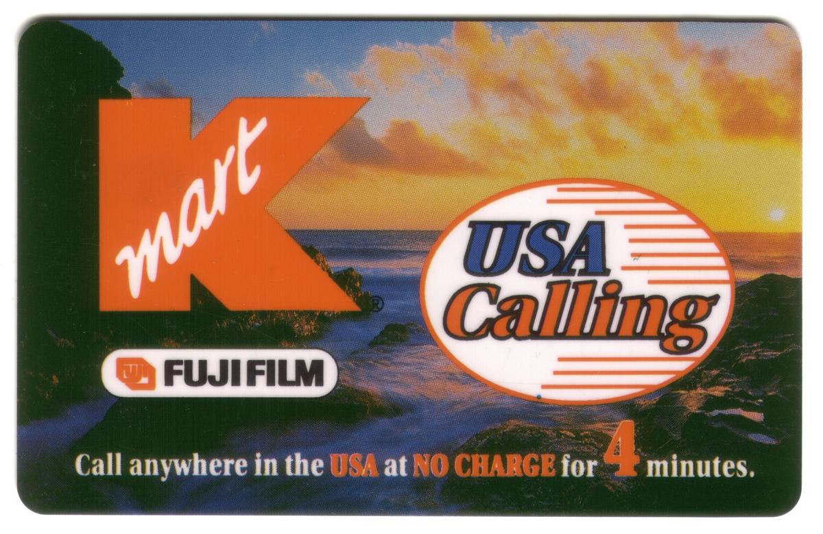 The card is promotional and branded with Kmart, highlighting its association with the retail chain. Additionally, the card has clear references to "Interactive Telenet," a telecommunications service, emphasizing its function in phone communication. The overall visual style is clean and straightforward, featuring a strong connection to both the USA calling service and the Kmart brand, with FujiFilm as a secondary logo element.
