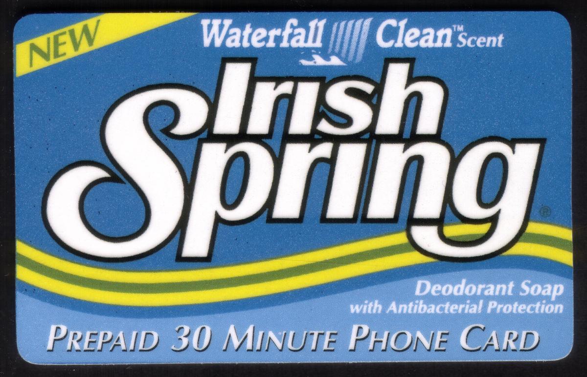 All visible text and design elements are clear and focused on promoting the Irish Spring soap brand in connection with the prepaid phone card service. The card is rectangular with rounded corners and a black border surrounding the edge.