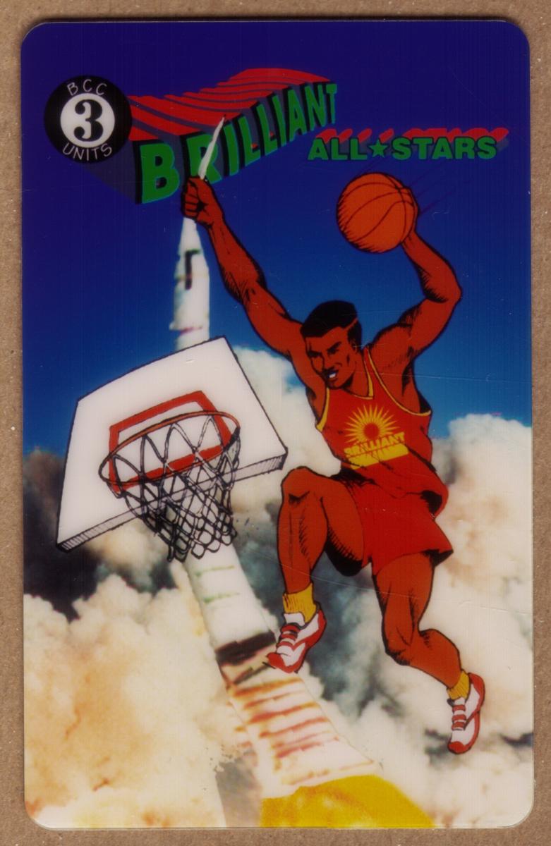 This collectible basketball-themed card features an illustrated male basketball player mid-air, performing a slam dunk. The player wears a red uniform with a yellow sunburst emblem on the chest and white and red sneakers. He is holding an orange basketball in his right hand, ready to score. The basketball hoop is detailed with a white backboard and red rim, positioned near a rocket launch scene.