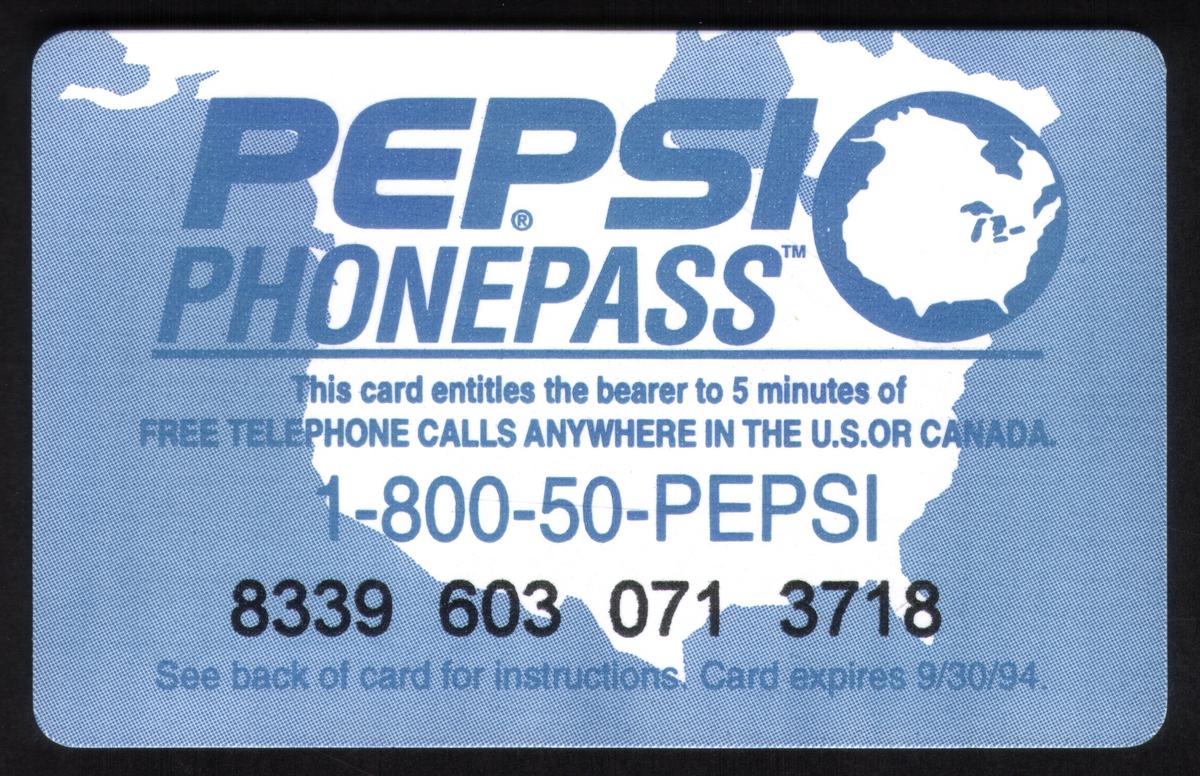 Additional text in small print states an expiration date of "9/30/94," specifying the card's validity period. The phrase "LDDS WorldCom" is visible near the map, referencing the telecommunications company associated with the card. The overall design integrates beverage branding with telecommunications service, combining Pepsi's recognizable identity with phone usage functionality. This card serves as a promotional item related to Pepsi-Cola and its affiliated companies within the United States and Canada.