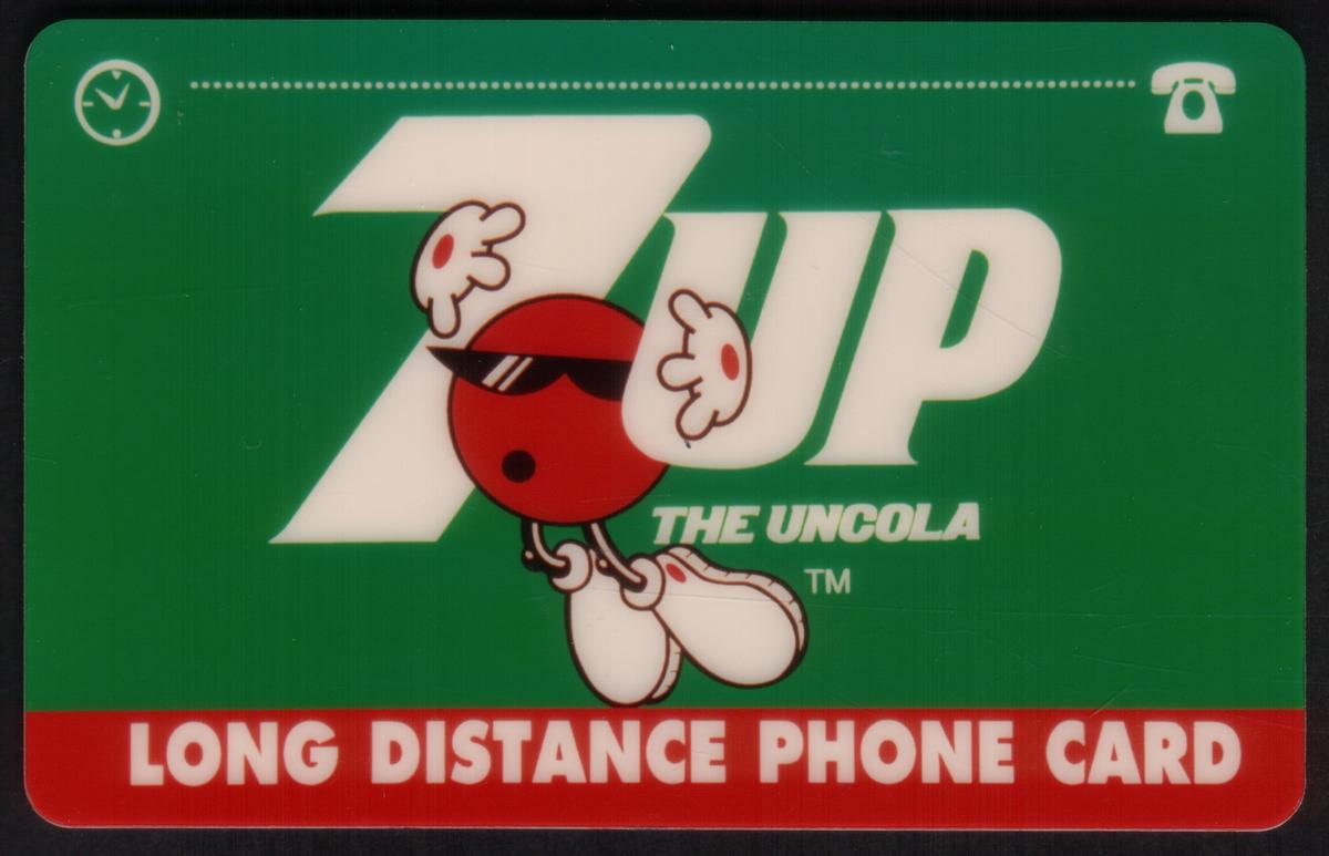 7-Up branding with the iconic logo, Red Dot mascot, green background, and a red banner indicating long-distance calling, blending nostalgia and utility. |