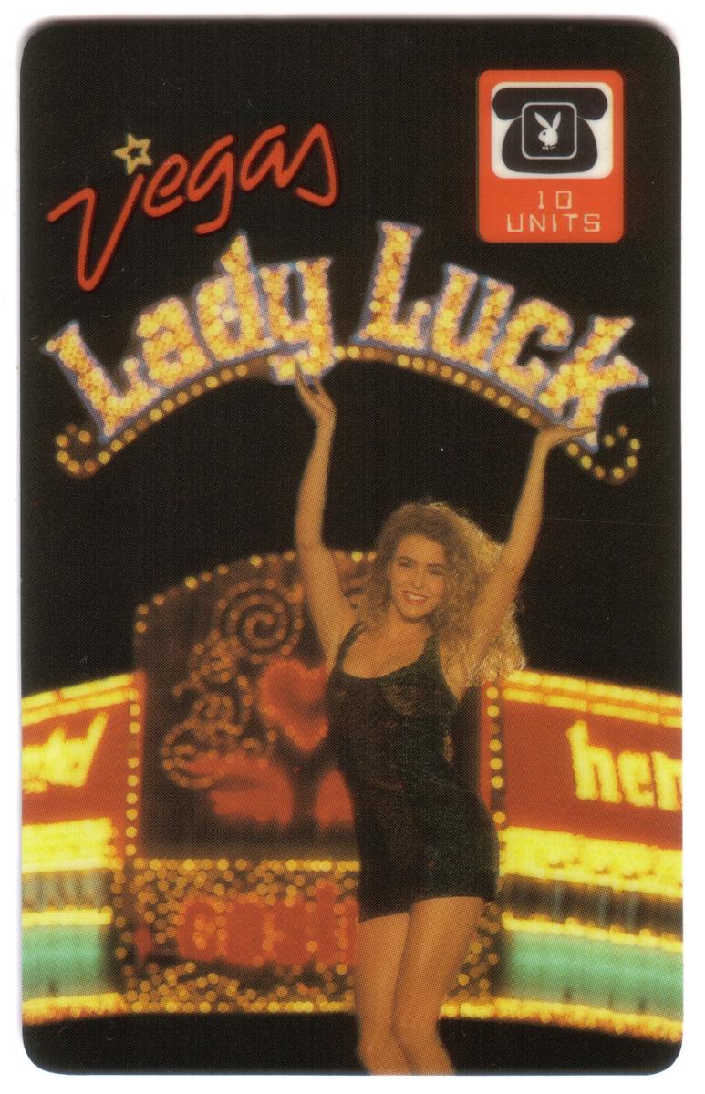 Las Vegas-themed Playboy phone card featuring Lady Luck, neon lights, confident woman, and the iconic Playboy logo, with 10 units for calling. |