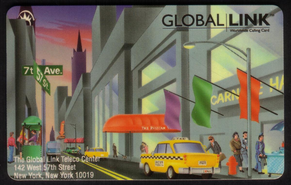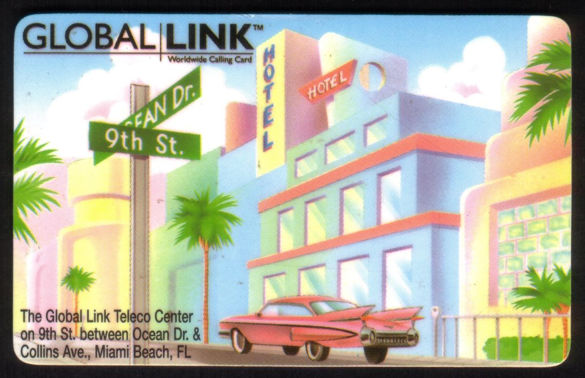 This set of collectible phone cards features vibrant artwork capturing iconic scenes from New York City and Miami Beach, Florida. The first card portrays a lively New York City street with yellow taxis, cars, and automobiles traveling along avenues framed by skyscrapers. Prominent details include the 7th Avenue and 57th Street signs, along with the presence of American flags. The overall style of this card blends cartoon and watercolor art elements, enhancing the urban atmosphere. The bottom of the card shows the logo and text of Global Link Telco Centers located in New York, NY.