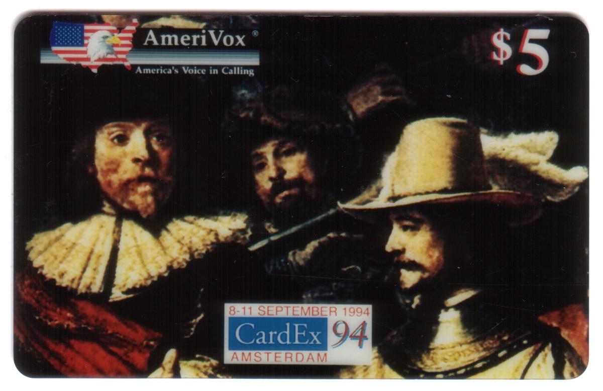 The card has a $5 value, and the design includes logos from Telecard Events and AmeriVox. The text on the card clearly identifies the theme as "CardEx '94: Rembrandt's Artwork from 1642 'The Night Watch'." Additional inscriptions include “Amsterdam Netherlands Holland,” linking the card directly to its Dutch cultural origins. The overall presentation highlights fine arts and Renaissance art, emphasizing the significance of Rembrandt’s work in art history.