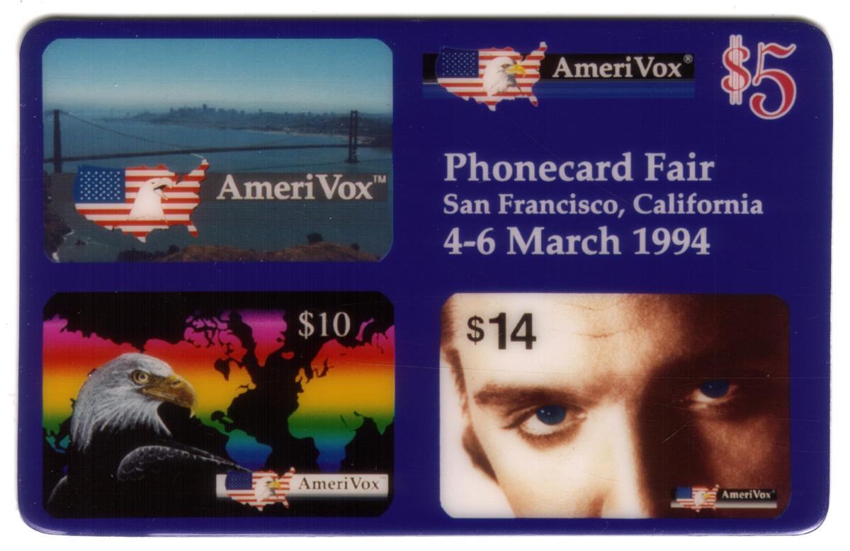 This collectible phone card set from AmeriVox features three different phone cards displayed on a blue background. The card highlights the Phonecard Fair held in San Francisco, California, from March 4 to 6, 1994. The top left card depicts a view of the Golden Gate Bridge with the San Francisco skyline in the background under a hazy blue sky. An AmeriVox logo with an American flag and eagle silhouette overlays the image.