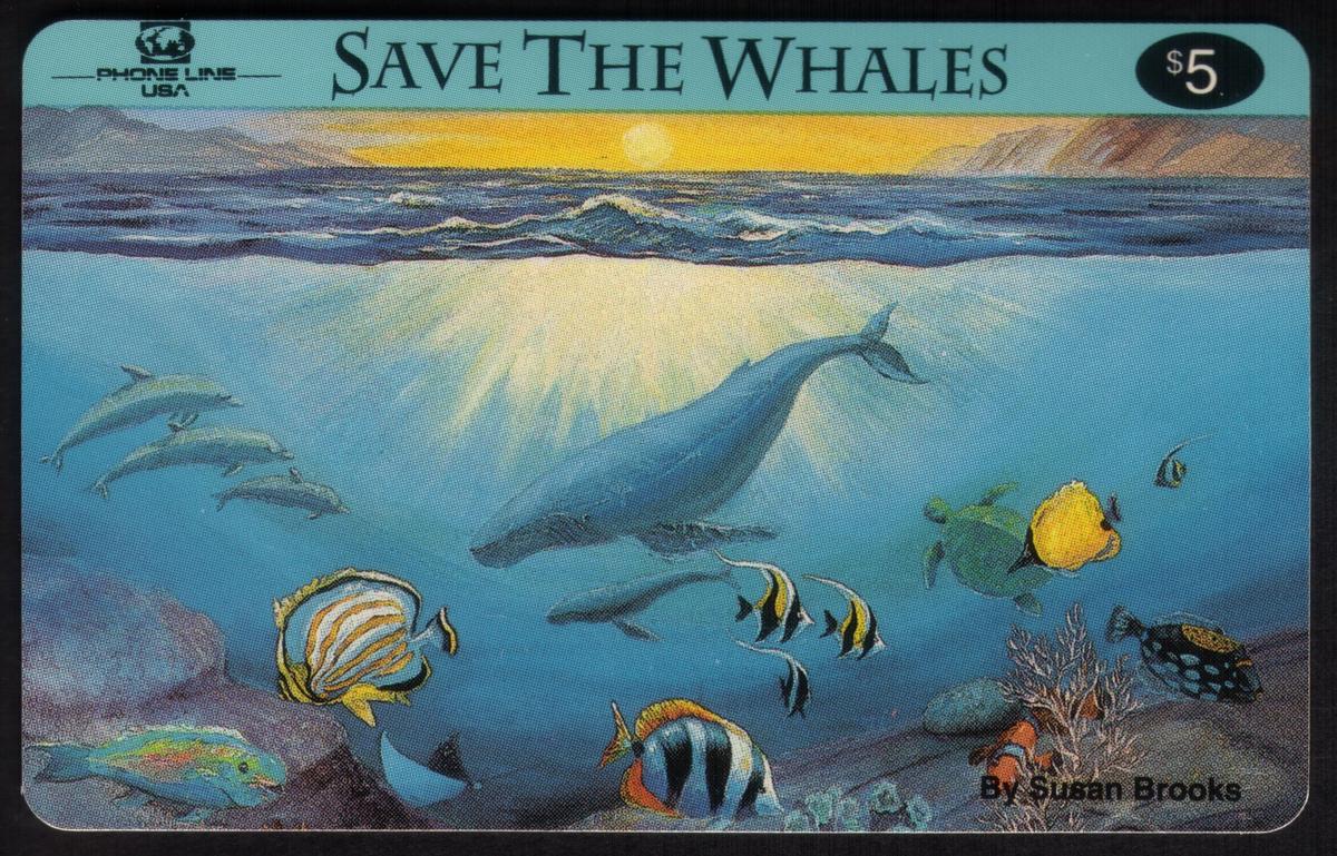 This collectible Phone Line USA phone card features detailed artwork by Susan Brooks, titled "Save The Whales - 2nd Edition," with a $5 denomination. The vibrant underwater scene depicts a variety of marine animals and wildlife, focusing on sea mammals and tropical fish. Central to the image are two blue whales swimming gracefully beneath the sunlit water’s surface, accompanied by smaller dolphins nearby.