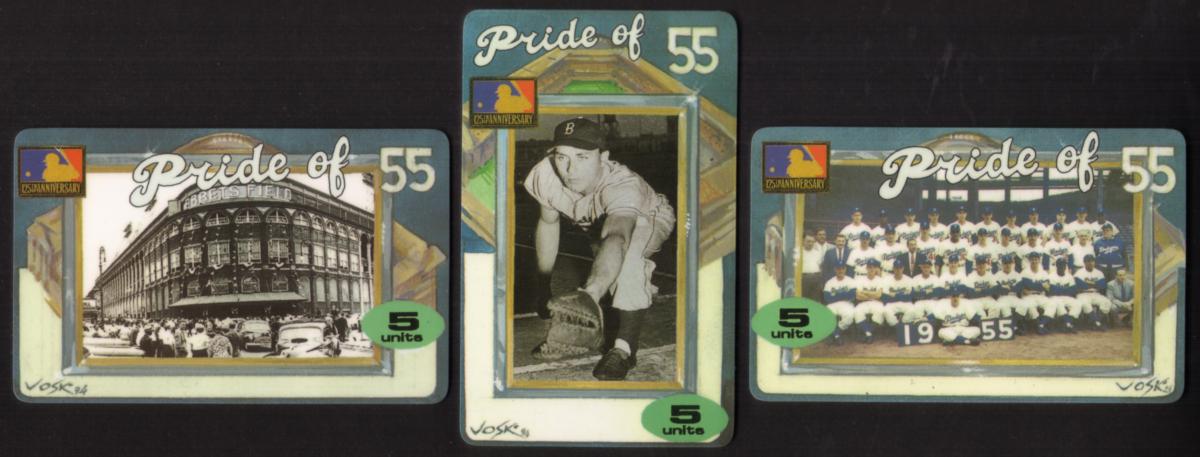 These three collectible phone cards are part of the "Pride of 55" series commemorating the 125th anniversary of Major League Baseball. Each card features a distinct image related to baseball in 1955, with a 5-unit designation marked in a green ellipse on the lower left or right corner. The phrase "Pride of 55" appears prominently in white, cursive style text at the top, along with the MLB 125th Anniversary logo in the upper left corner, which includes a silhouette of a baseball player.