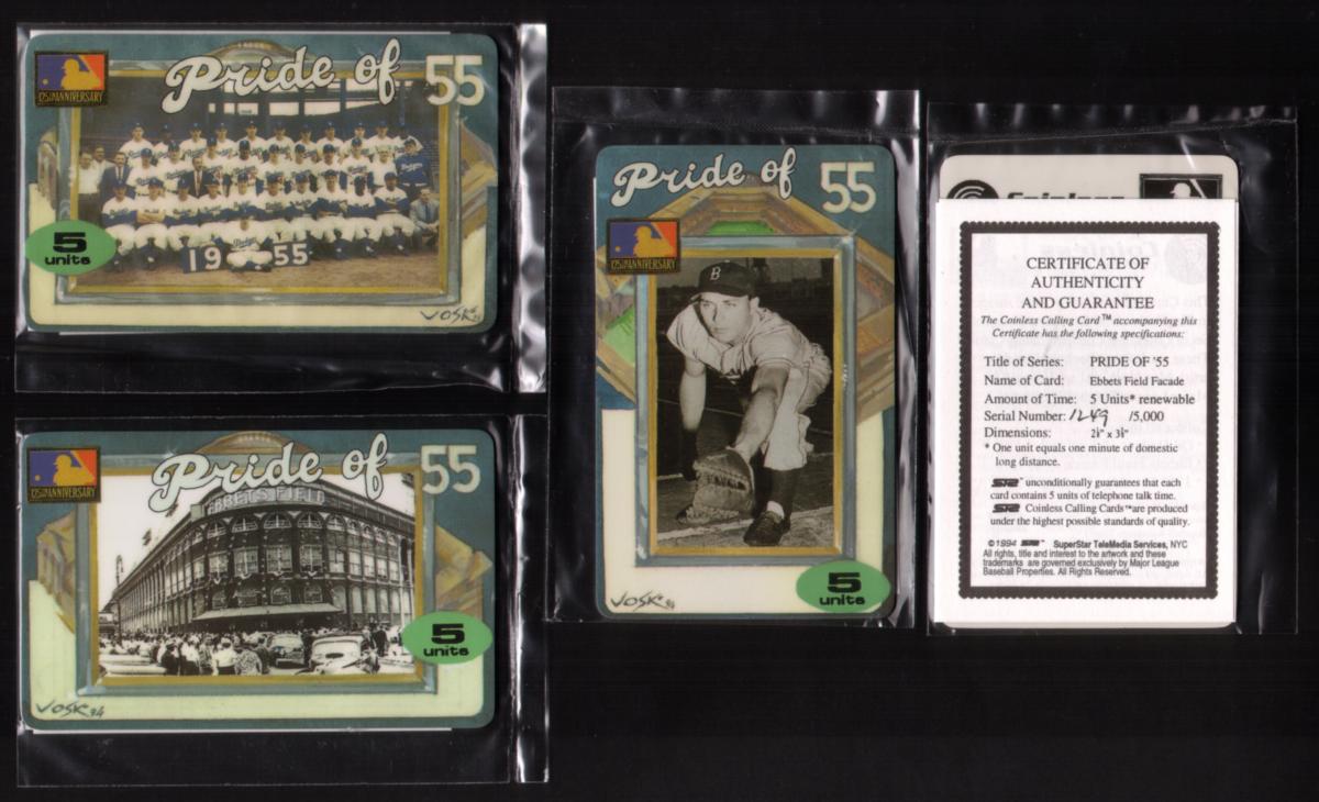 The first card displays a famous team photograph of the 1955 Brooklyn Dodgers in uniform, arranged in rows inside a baseball stadium. The players and team staff are lined up behind a banner reading "1955," showcasing their celebrated season. The setting is Ebbets Field, which is evident on the third card.