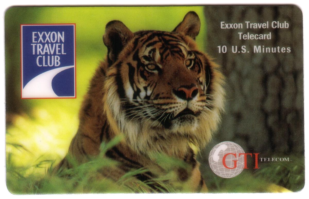 Features a tiger in a lush natural setting, Exxon Travel Club branding, 10 U.S. minutes telecommunication, and GTI Telecom logo for travel and communication. |