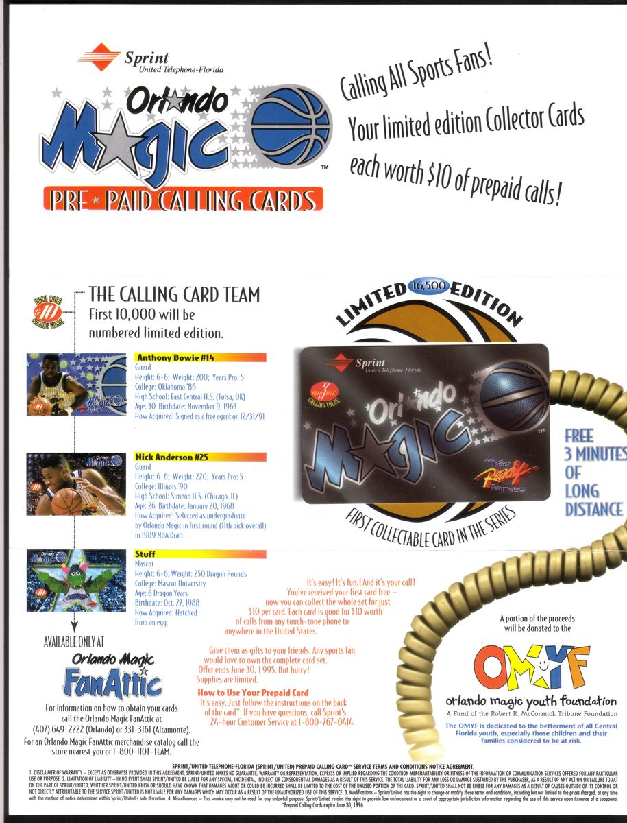 This card was issued in January 1995 and is recognized as the first NBA licensed Orlando Magic basketball promotional collectible card associated with Sprint and United Telephone of Florida. It celebrates the Orlando Magic as part of the National Basketball League (NBA).