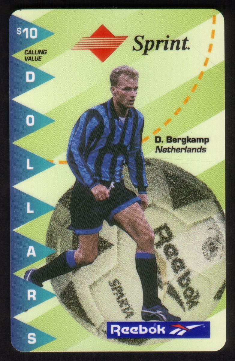 This collectible Sprint phone card features Dennis Bergkamp, a Dutch soccer player, prominently displayed in a dynamic action pose. Bergkamp is wearing a blue and black vertically striped soccer jersey paired with black shorts and socks, with the image focusing on his movement on the field. His name is printed on the card as "D. Bergkamp," along with the designation "Netherlands," indicating his nationality.