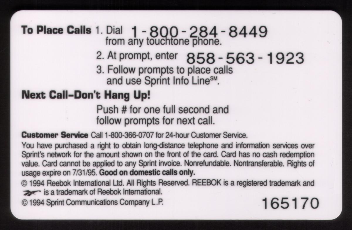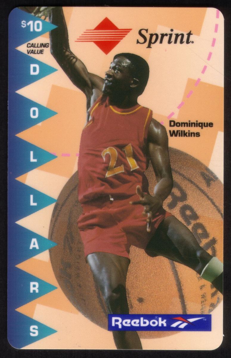 The card has a $10 calling value indicated at the top left corner within a blue diamond shape. The Sprint logo appears near the top right corner, indicating the telecommunications company that issued the card. The Reebok logo is positioned at the bottom right, reflecting the sportswear brand associated with Dominique Wilkins.