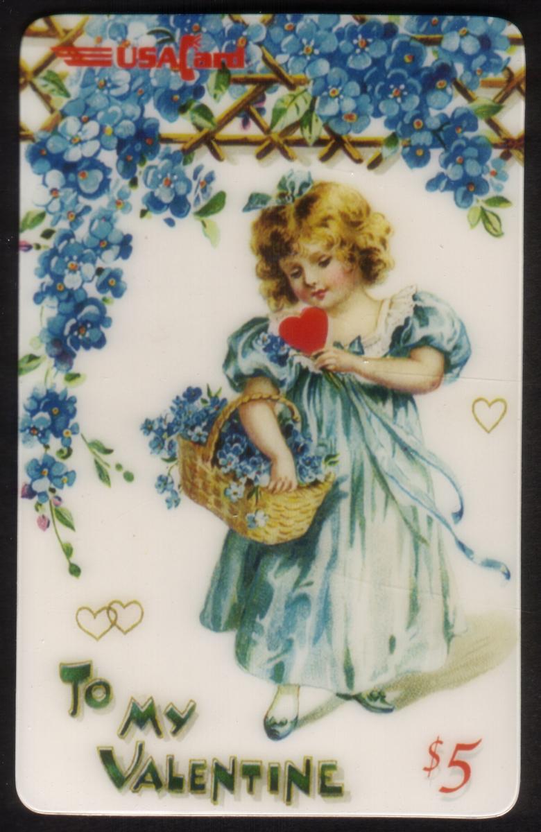 This collectible phone card features a charming illustration of a flower girl holding a red heart and a basket filled with flowers. The design emphasizes themes of romance and love, fitting for Valentine’s Day. Red hearts and floral elements decorate the card, enhancing the romantic feel. The card includes the text "$5. To My Valentine," highlighting its connection to Valentine's Day celebrations.