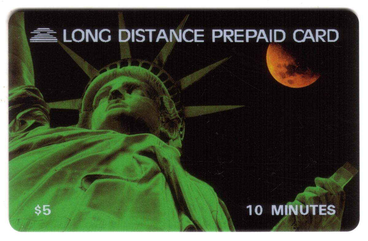 This collectible long distance prepaid card features a photographic image of the Statue of Liberty in New York City, New York, one of the most iconic American national monuments. The photo captures the statue from a low angle, emphasizing the statue’s face and the crown’s spikes, with a dark night sky as the backdrop. A reddish-orange moon is visible in the upper right corner of the card, adding a striking celestial element to the design.
