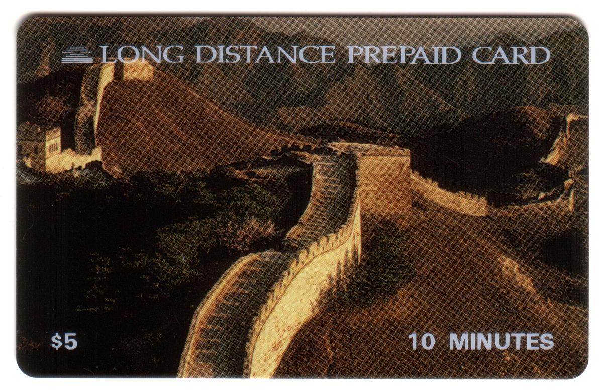 This collectible phone card features a detailed image of the Great Wall of China, one of the most iconic and historically significant landmarks in Chinese history. The card captures a section of the wall with its characteristic stone construction winding across the hilly terrain. The stone walls and watchtowers stand prominently under a clear sky, emphasizing the scale and architectural strength of this ancient structure. The Great Wall is recognized as a Chinese national monument and symbol of China's historical legacy.