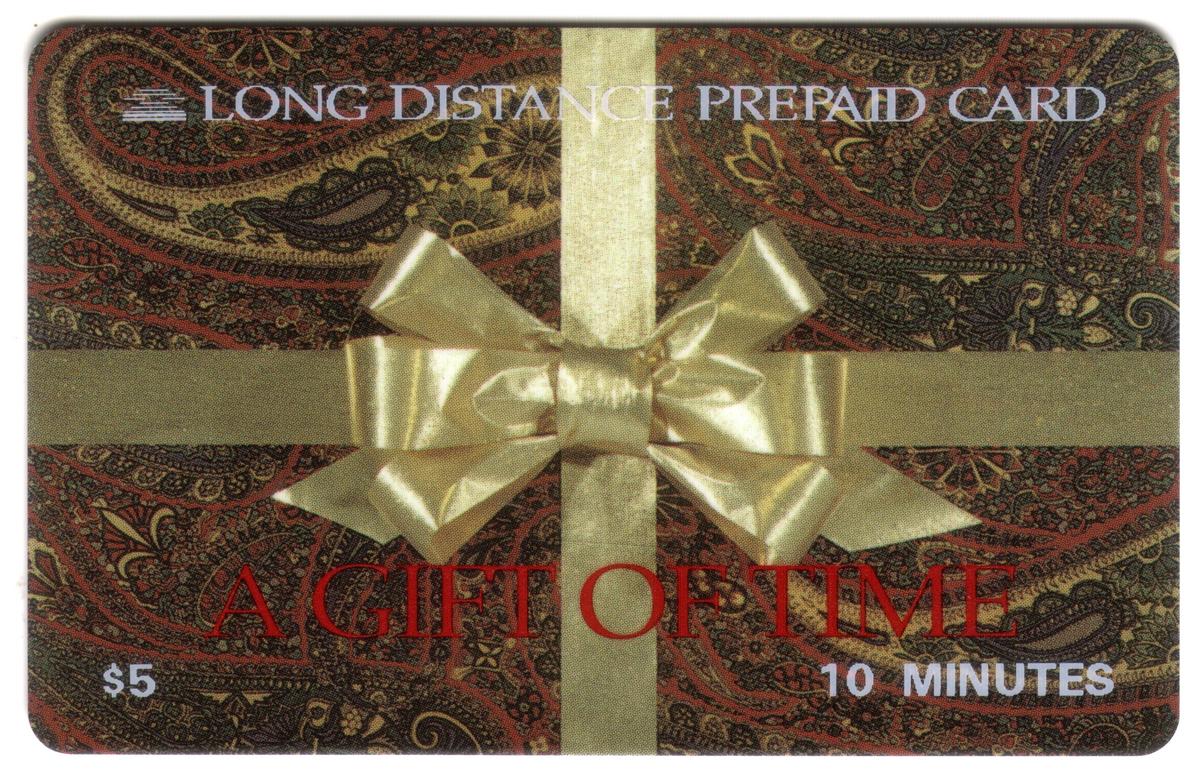 Text on the card includes “$5.” indicating a monetary value, and the phrase “A Gift of Time” appears prominently on the design. The card also displays the brand name “LDDS WorldCom” in clear, legible letters. The overall style of the card emphasizes gift-giving and celebration, with the elegant wrapping and decorative bow underscoring its theme.
