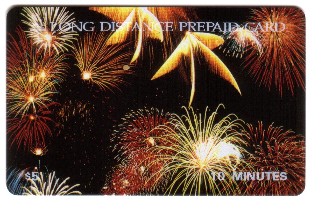 In the background, rows of sparkling lights add to the celebratory atmosphere. The lights appear in clusters that enhance the overall brightness and depth of the image. The lower part of the card carries text indicating a value of $5 and mentions “(10m) Fireworks Display.” The text “User Cards” and “LDDS WorldCom” are clearly displayed, identifying the card’s issuer as WorldCom.