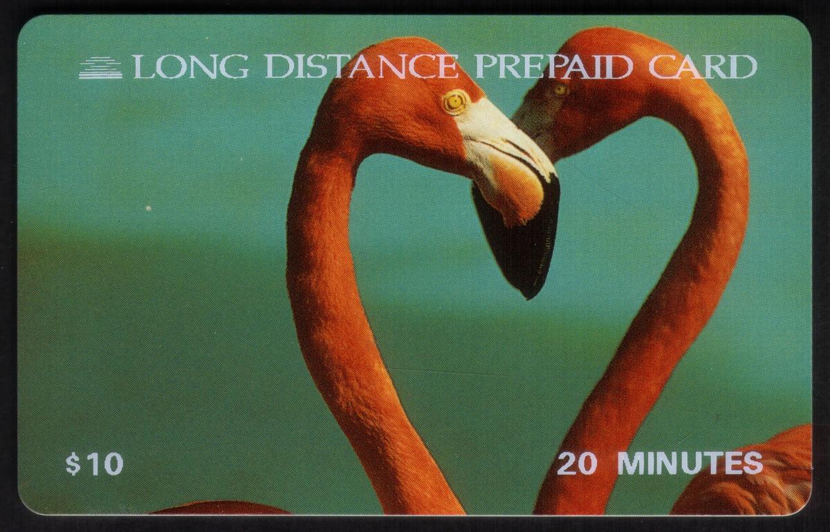 This collectible phone card features a vibrant photograph of several flamingos standing in shallow water in Florida. The image highlights the bright pink plumage of the flamingos against a natural environment, capturing details such as the reflections in the water and the birds’ distinctive curved beaks. The scene conveys a sense of wildlife native to Florida.