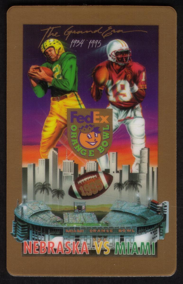 The card highlights the sporting event by naming the “1995 Orange Bowl Football” and features the official Orange Bowl and FedEx logos, indicating a sponsorship association. The text includes “Nebraska VS Miami,” clearly identifying the teams competing in the game. Additional football-related graphics such as helmets and footballs appear to enhance the theme of the card.