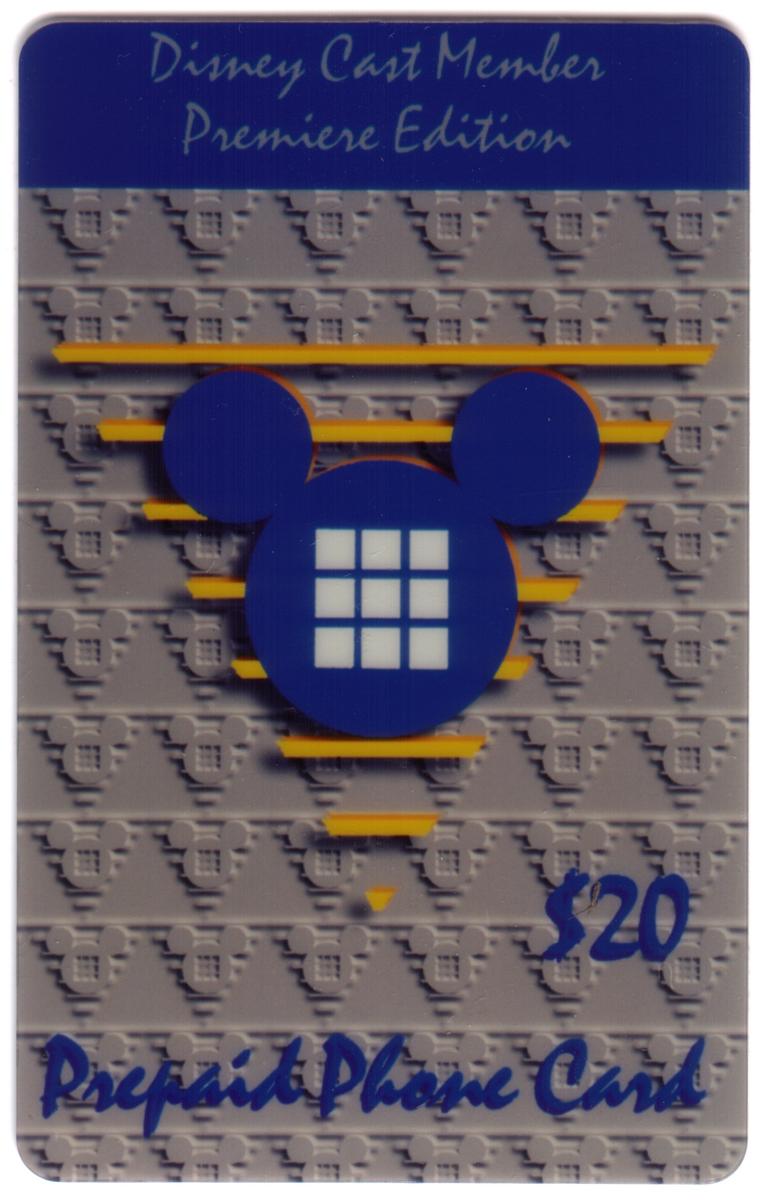 This collection features a set of Walt Disney prepaid phone cards and charity-themed phone cards from the 1990s, presenting various designs and denominations. Several cards display a consistent Disney Cast Member Premiere Edition design with a blue Mickey Mouse head silhouette containing a white keypad pattern, set against different textured backgrounds in blue, grey, and yellow. These cards show prepaid values of $5, $10, and $20 prominently indicated in gold or dark blue text. The phrase "Prepaid Phone Card" is written in scripted gold and blue lettering, and one card also includes the "Disney Cast Member Premiere Edition" label along the colored vertical edge.