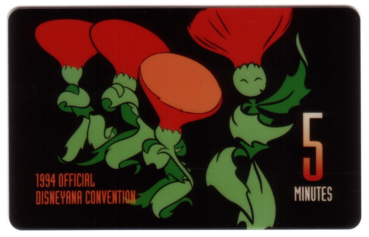 Additional Disney-themed cards include artwork from the 1994 Official Disneyana Convention featuring whimsical green trumpet flowers on a black background with the text "5 MINUTES" in large, orange and white font. Another card displays a whimsical logo for TELECOM MAGIC '94, accompanied by "Lake Buena Vista, Florida" on a silver-grey background with yellow stars and a small Mickey Mouse icon.