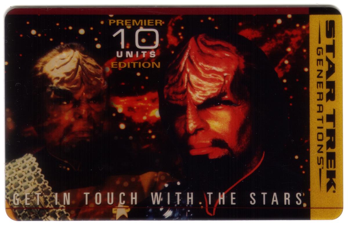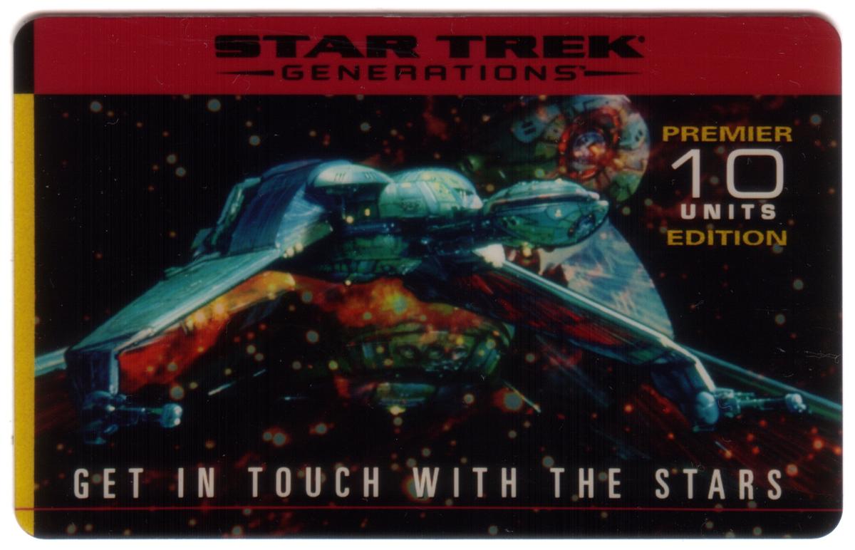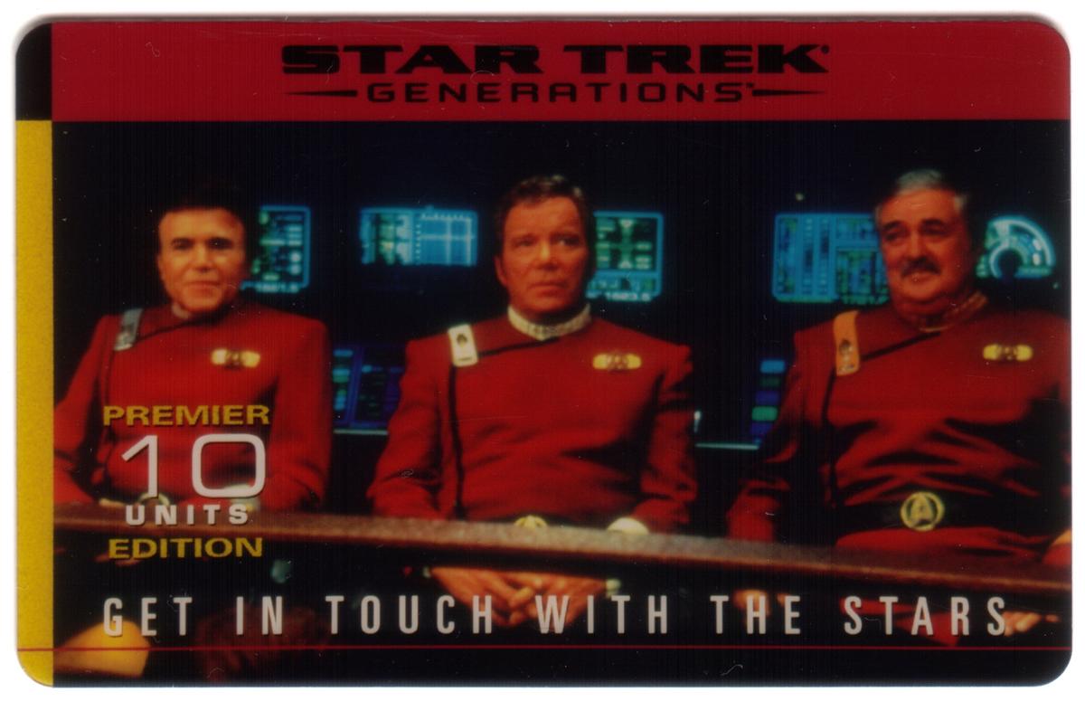 This set features 13 collectible phone cards themed around the movie "Star Trek Generations." Each card displays vivid scenes and characters from the film, capturing memorable moments and key figures. The cards prominently feature the "Star Trek Generations" logo on a gold or red vertical bar on the left or top, with "Premier 10 Units Edition" marked near the center. The phrase "GET IN TOUCH WITH THE STARS" runs horizontally along the bottom of each card.