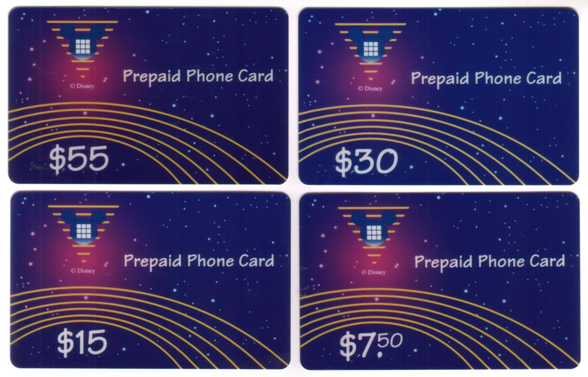 These prepaid phone cards are Disney-themed collectible items featuring a distinctive design against a dark blue starry background. Each card prominently displays a stylized phone keypad icon shaped like Mickey Mouse’s head with glowing purple light behind it. The design includes several curved golden lines sweeping across the lower portion of the cards, creating a sleek, flowing visual effect.