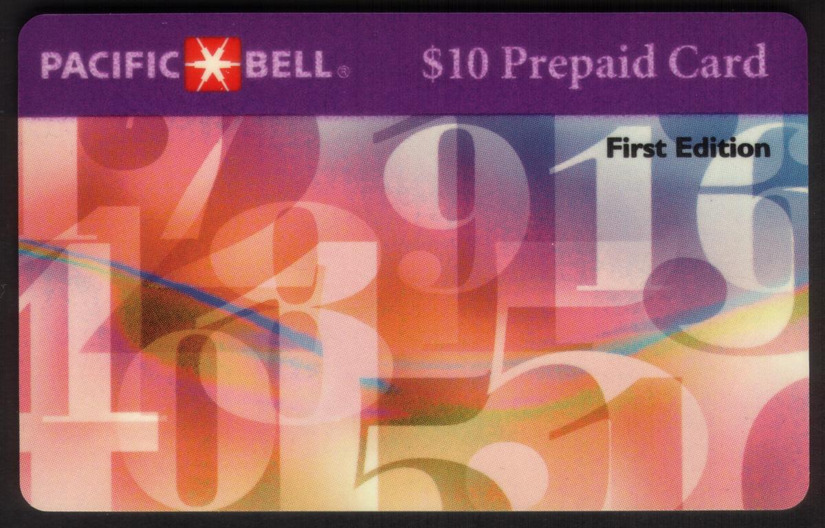 At the top right corner, the card clearly shows a denomination of "$10," indicating its value. The text "Floating Numbers First Edition" is also present, along with an expiration date of "01-16-96." The card is issued by Pacific Bell, whose logo appears on the lower right side. Other textual elements include "G10" and "G110B," which are positioned beneath the "$10" denomination and add to the card’s identification details.
