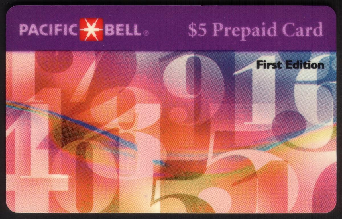 The third series features an abstract composition of overlapping numbers ranging from 1 to 16 in various fonts and sizes. The colors blend warm oranges, reds, blues, and purples with a subtle diagonal rainbow streak crossing the design. The text "First Edition" is placed on the right, and each card includes the denomination value in the upper right corner on a purple band along with the Pacific Bell logo on the top left.