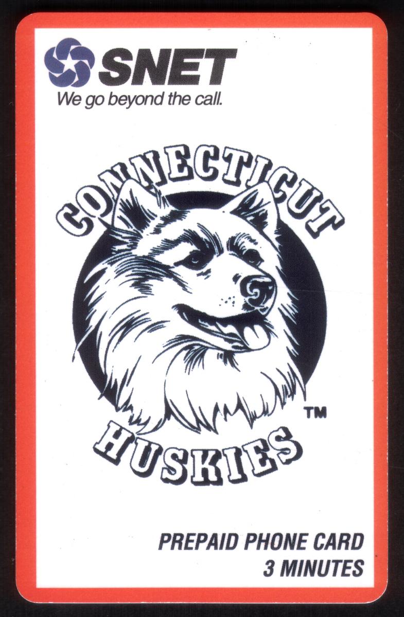 The background of the card includes a football-themed design, incorporating an action shot of a husky dog, symbolizing the team’s mascot and emphasizing the connection to football and animal themes. The card also features the official logos of New England Telephone (SNET) and WorldCom, highlighting their involvement or sponsorship at that time. The use of the university’s blue and white colors is integrated into the card’s design, reinforcing the affiliation with the Connecticut Huskies.