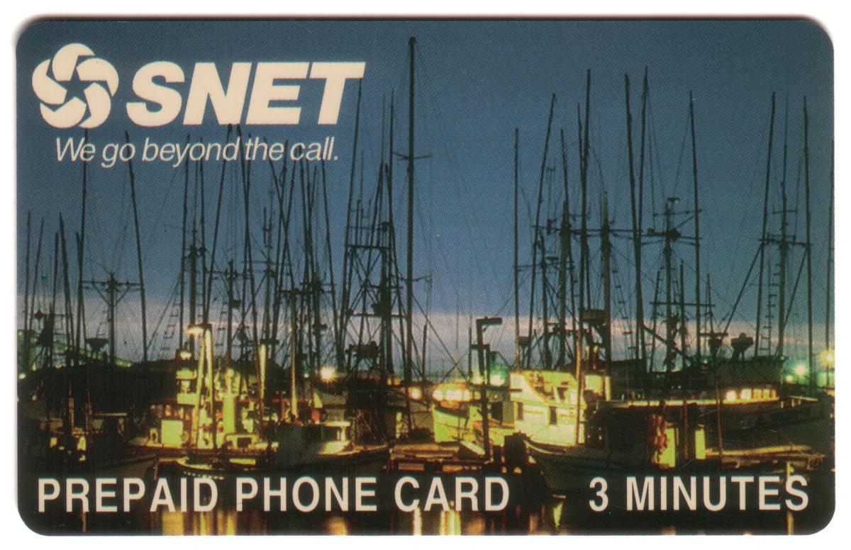 The phone card includes the text "3u Boats In Harbor Scene At Sunset (1994) Complimentary Issue" printed prominently, along with the name "New Eng Tel" and the abbreviation "SNET," identifying the issuing telephone company as Southern New England Telephone. The card’s design emphasizes nautical themes such as boating and harbors, aligning with the image displayed.