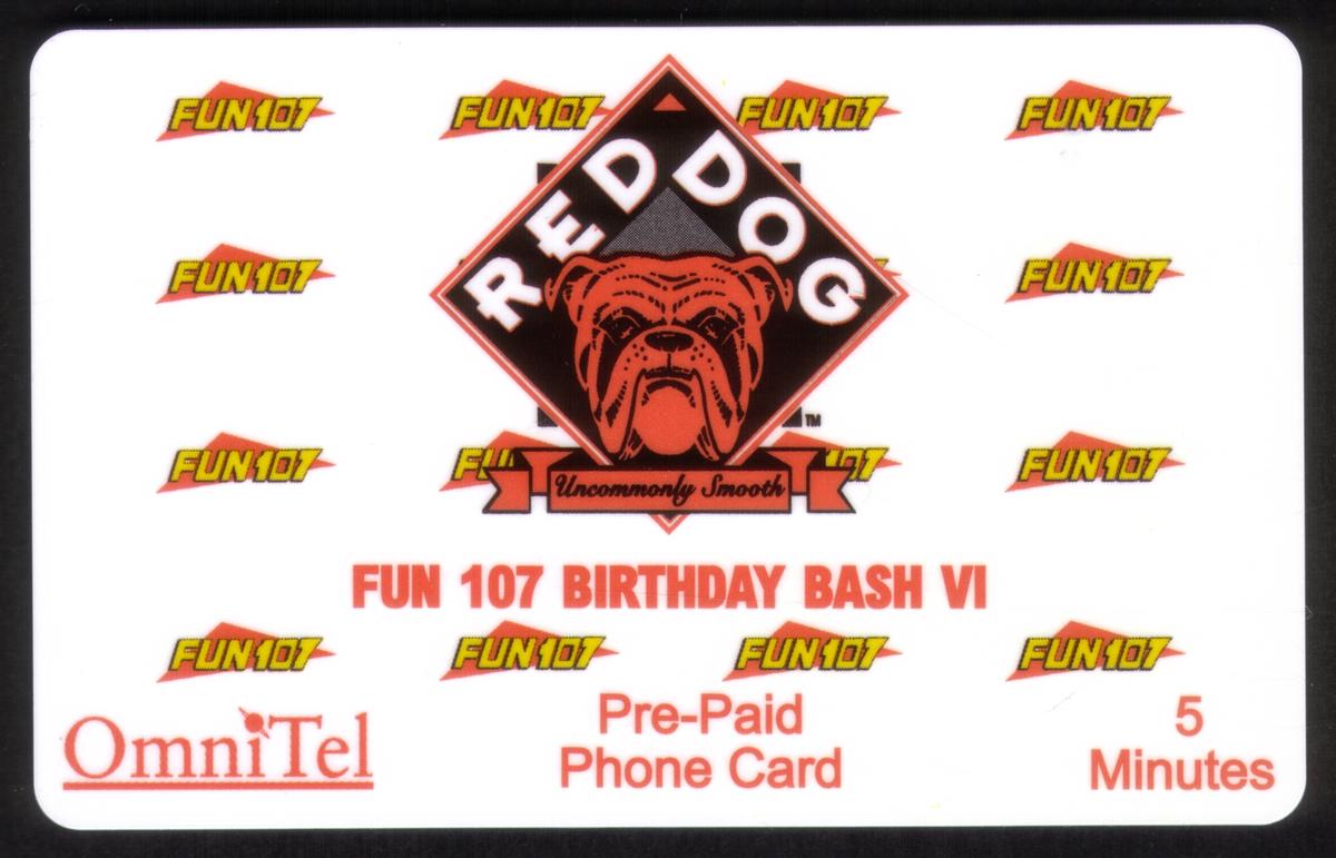 This collectible phone card features a promotional design for Red Dog Beer and Fun 107 Birthday Bash VI. The card has a horizontal orientation and includes the text "Red Dog Beer: Fun 107 Birthday Bash VI" prominently displayed. The design includes a vibrant red background with imagery and branding related to the Red Dog Beer product as well as Fun 107, a radio station known for music and entertainment events.