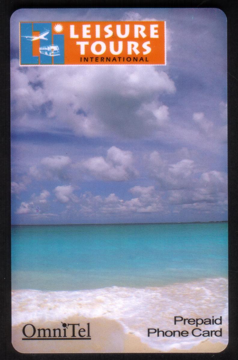 At the top left of the card, there is the Leisure Tours International logo, which consists of an orange banner with the text "LEISURE TOURS" in white, and "INTERNATIONAL" in smaller black letters beneath it, accompanied by small white airplane graphics to the left within a blue square background. The lower left corner displays the OmniTel brand name in a classic serif font, while the lower right corner contains the text "Prepaid Phone Card" in a straightforward black font.