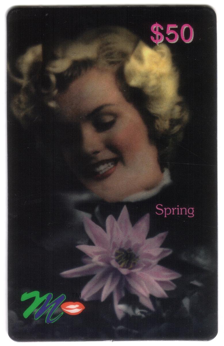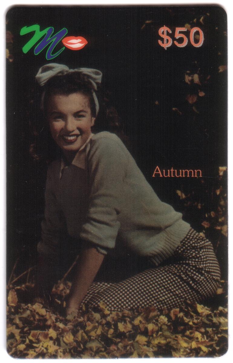 This set of four collectible phone cards features iconic images of Marilyn Monroe, each card representing a different season of the year. Each card has a $50 denomination prominently displayed in the top right corner in varied colors matching the seasonal theme.
