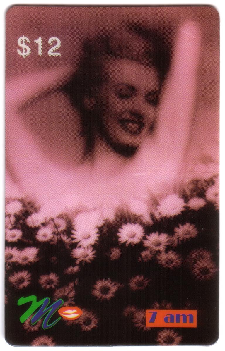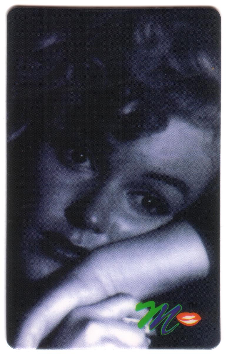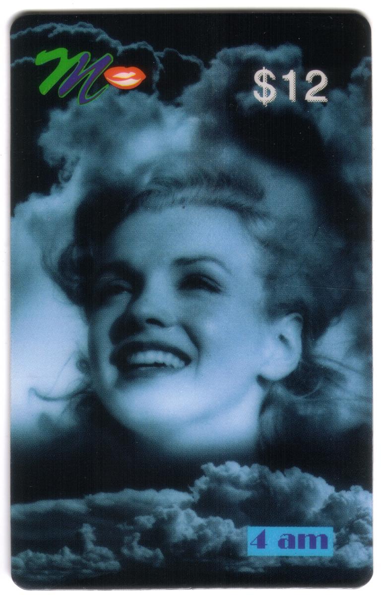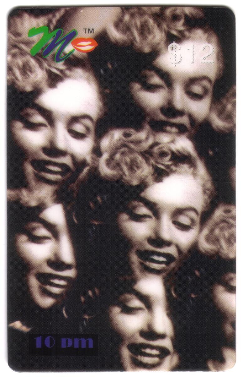 This set of nine collectible phone cards features iconic black-and-white and tinted photographic portraits of Marilyn Monroe. Each card has a $12 value marked in the upper right corner and includes a stylized "M" logo with a red lips motif in the top left corner, except for the ninth card which lacks the logos and value marking. Each card also features a distinct time label in the bottom right corner, ranging sequentially from "1 am" to "7 pm" and finishing with "10 pm."