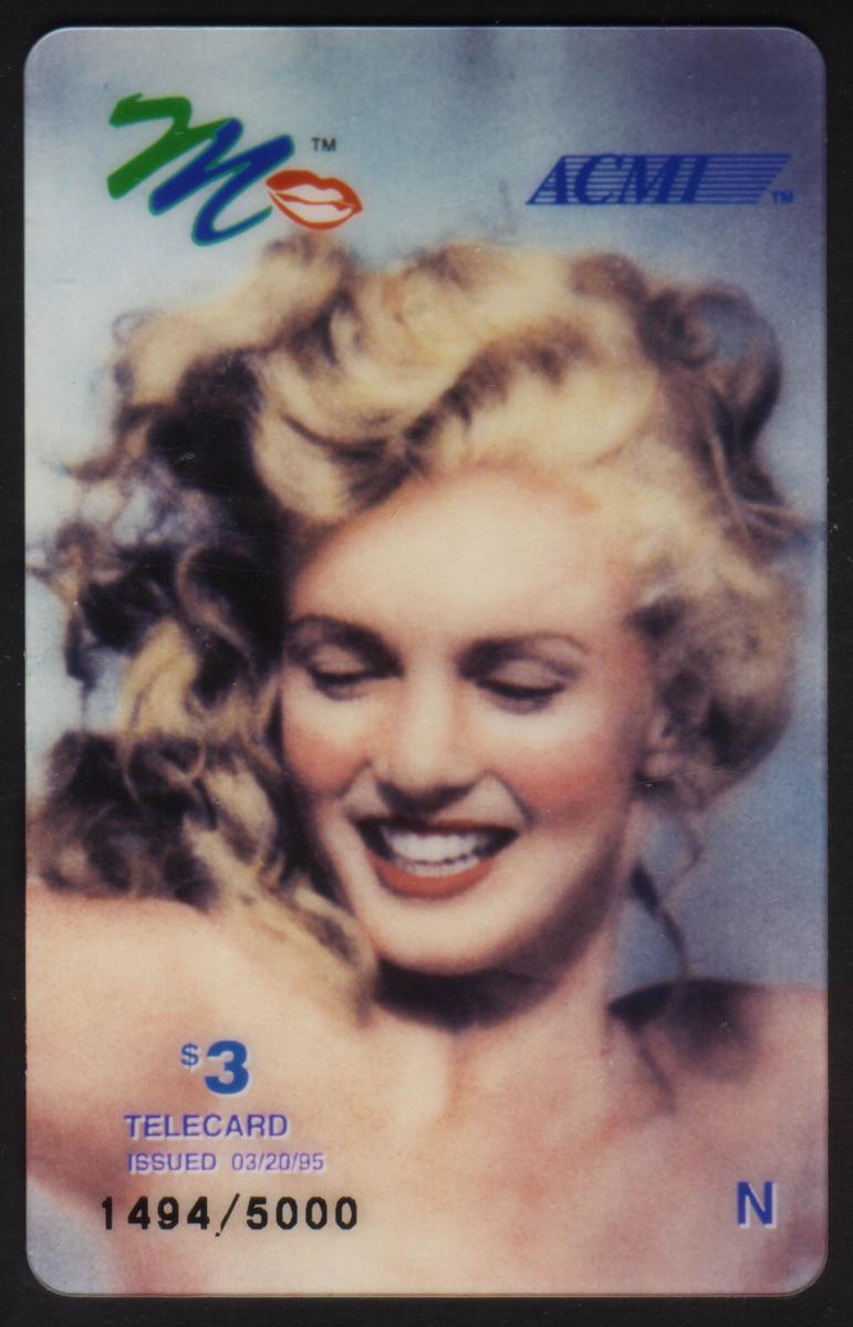 The card includes printed text with the name "Norma Jeane," Marilyn Monroe’s birth name, reinforcing the connection to the actress. The date "03/20/95" and the terms "Laser Radio" and "ACMI $3" appear, indicating collectible or promotional elements related to Marilyn Monroe. The design is clean, focusing on the portrait and these details without additional graphics or distractions.
