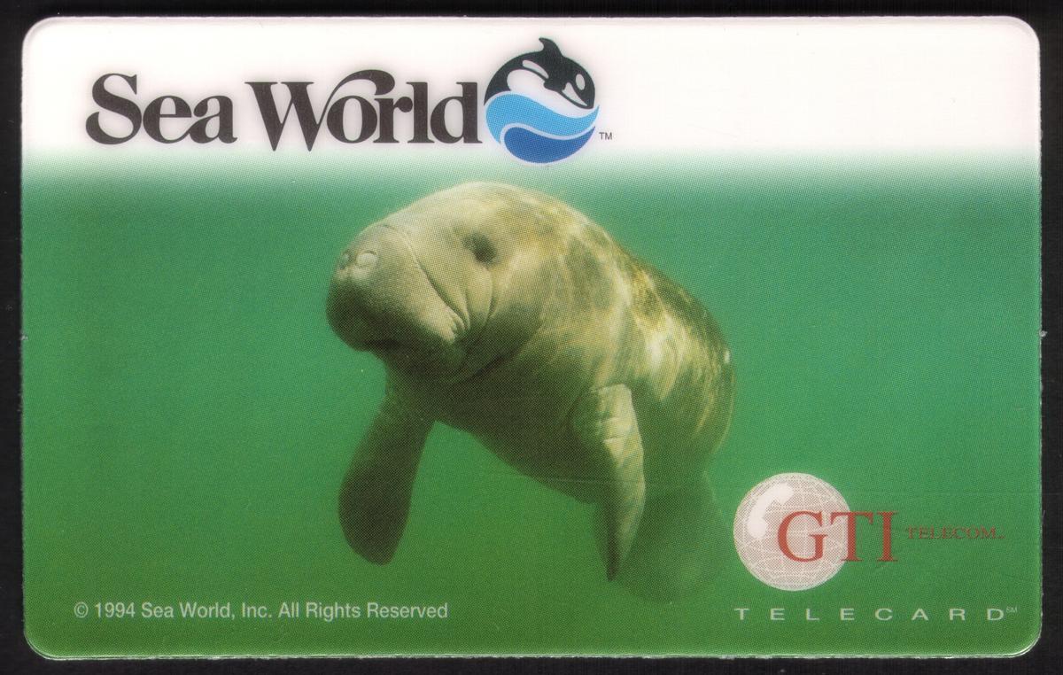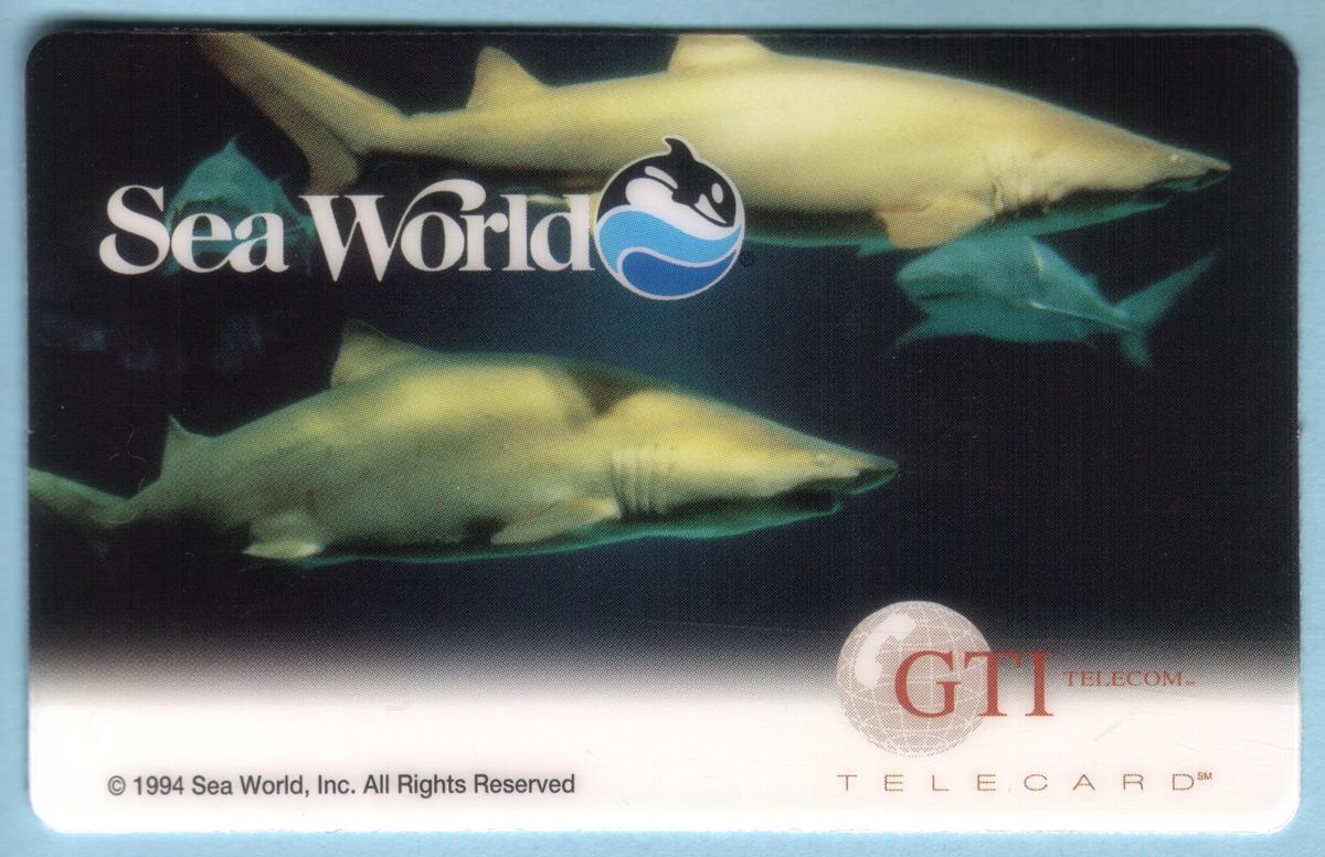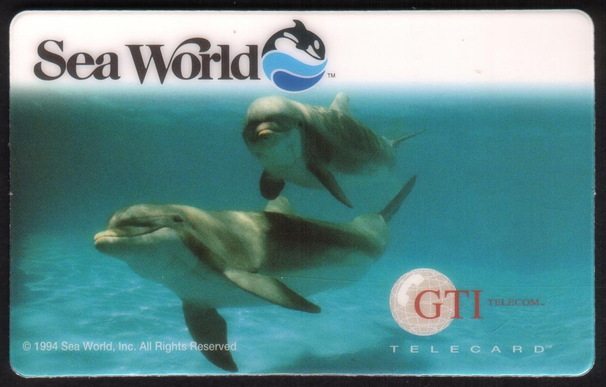 This is a set of six collectible phone cards issued by GTI Telecom featuring images from Sea World in Orlando, Florida. Each card prominently displays the Sea World logo with its orca emblem and the GTI Telecom logo, indicating their partnership in producing these telecards. The cards date to 1994 and highlight various aquatic animals found at Sea World, emphasizing the park’s marine life attractions.