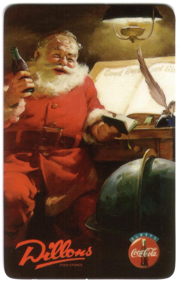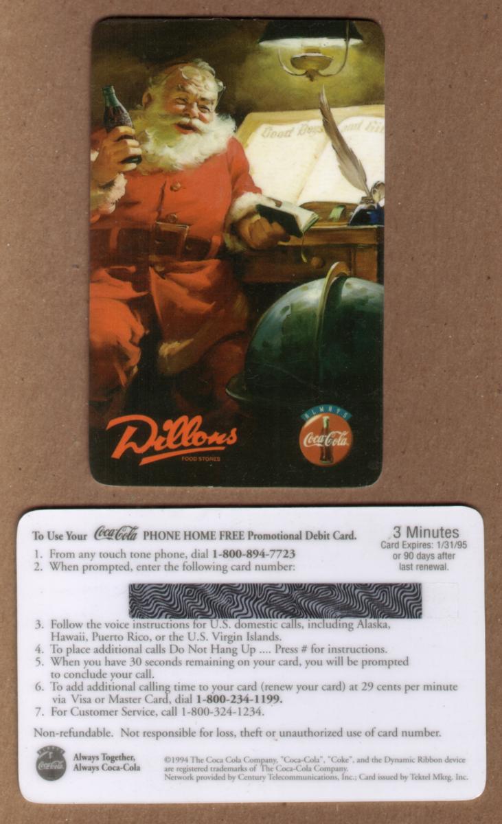 Elements such as Santa’s jovial expression, the bottle of Coke, the quill, globes, and Christmas motifs reinforce the festive atmosphere. This collectible phone card celebrates traditional Coke advertising imagery and the holiday season, specifically referencing Dillon’s 3M and TekTel Marketing Inc.