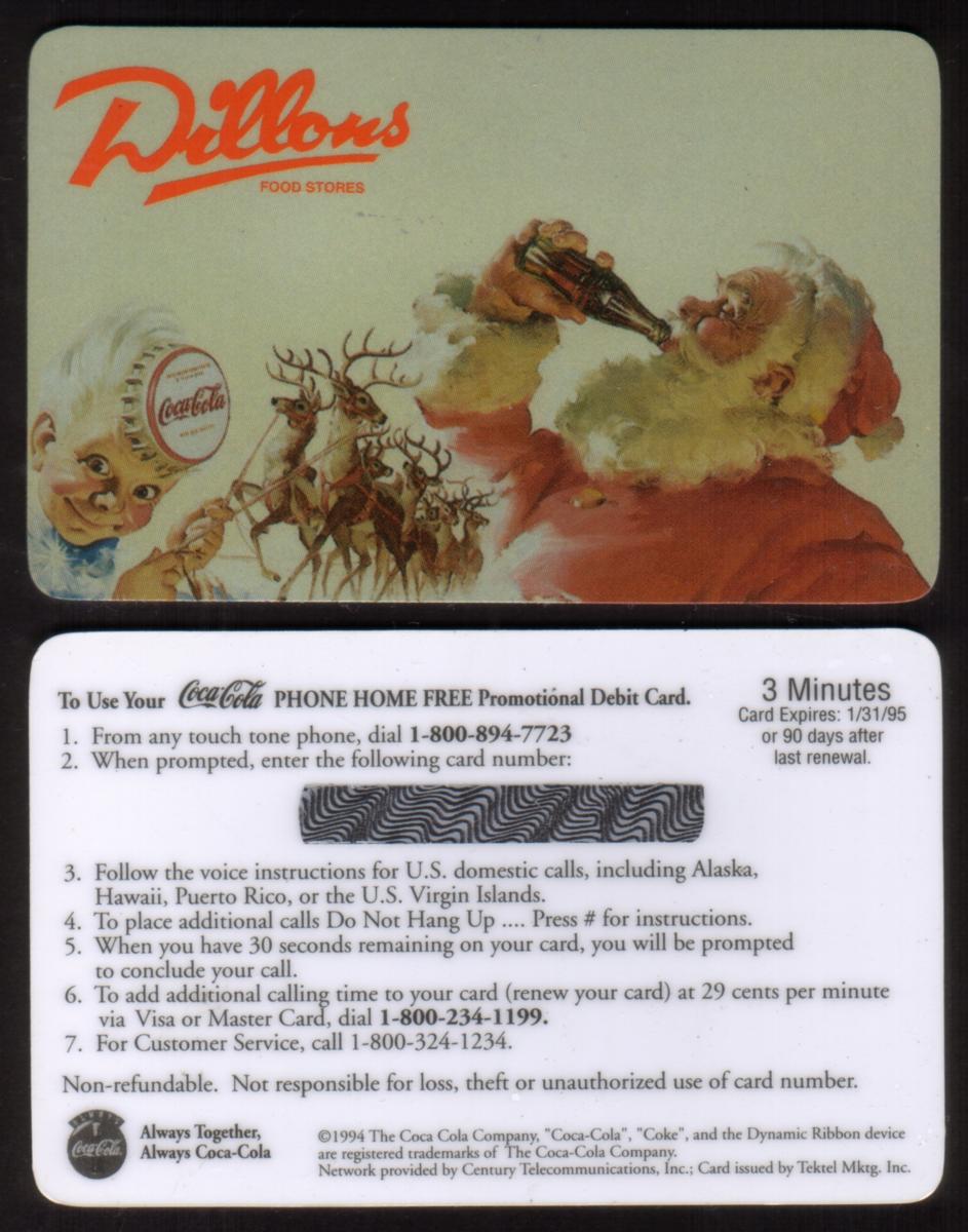 The card integrates key elements such as the Coca-Cola and Coke logos, Santa Claus, Christmas themes, reindeer, and Santa’s sleigh in a warm, nostalgic style. This collectible phone card was produced by TekTel Marketing Inc. and carries the branding of Dillon’s Food Stores. The artwork represents a classic holiday promotion blending Coca-Cola’s advertising with festive seasonal imagery.