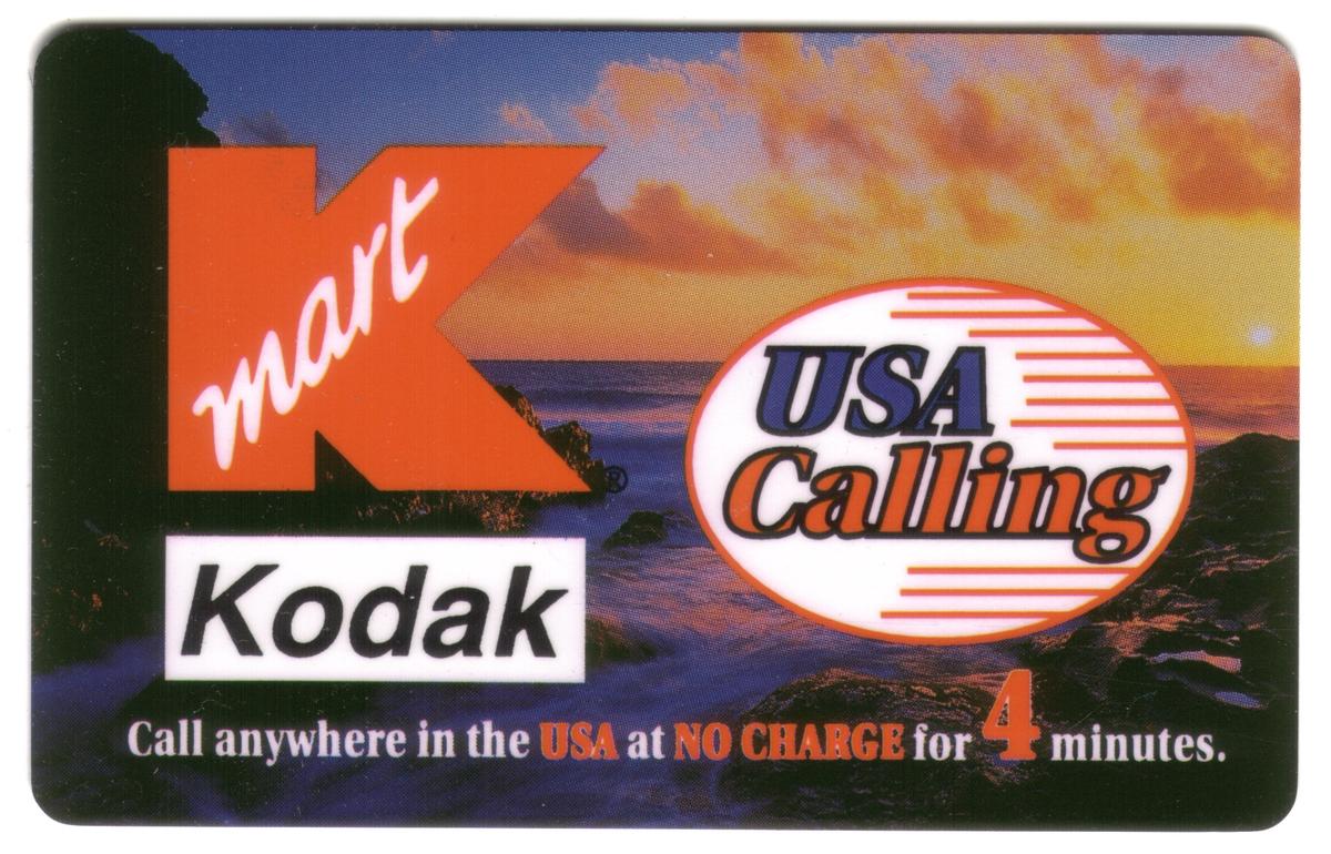 This promotional phone card is associated with Kmart, Kodak, and USA Calling, offering four free minutes of calling time anywhere in the United States. The imagery and text reflect a promotional partnership linking these brands with USA Calling services.