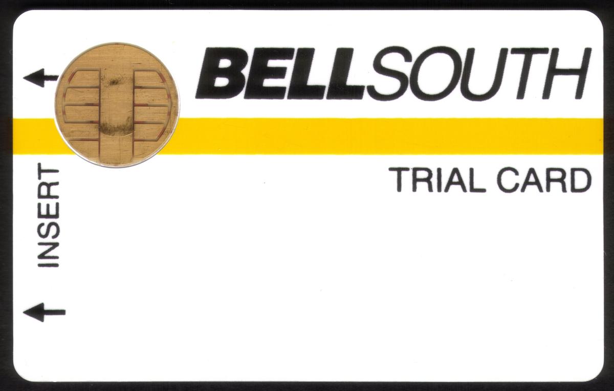This card is a collectible corporate branded stored value chip card issued by BellSouth Telecom. It represents an early example of telecom testing cards designed for use with chip and magnetic stripe technology during initial trials in 1989.