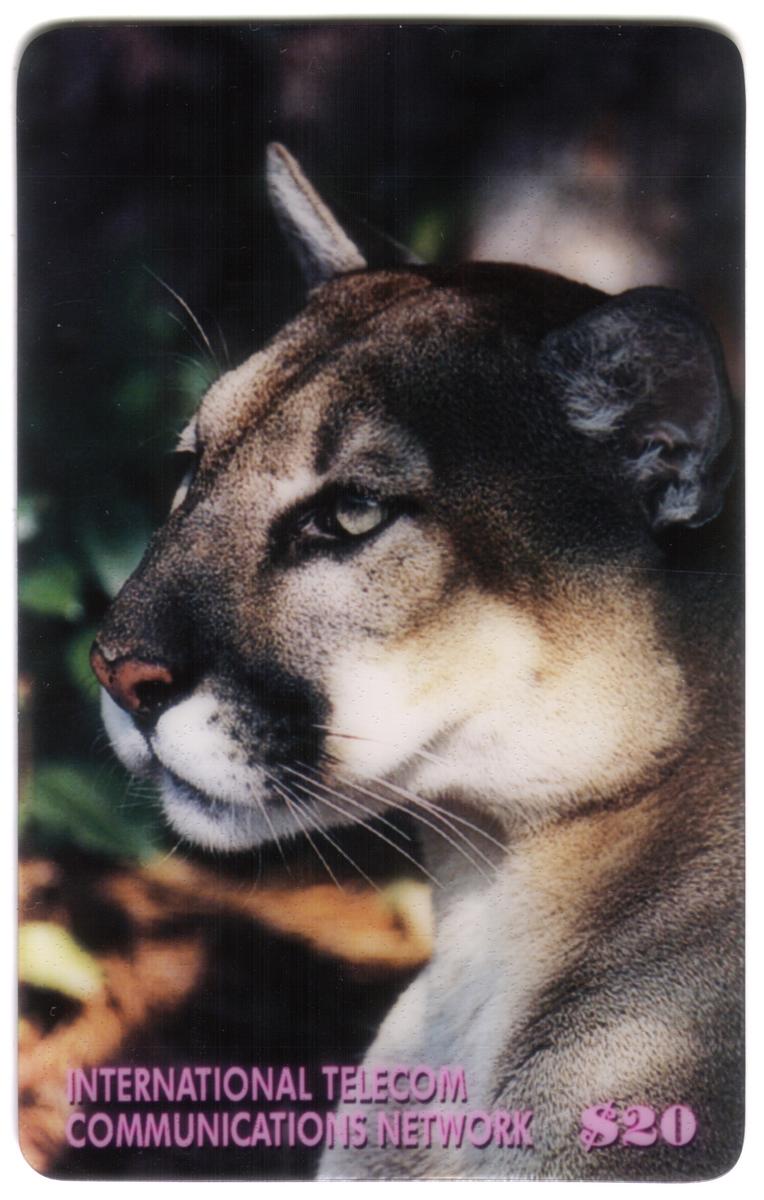 The background of the card remains simple to ensure focus remains on the Florida Panther’s portrait. The card’s edges display perforated lines, indicating it may have been part of a larger sheet or collector’s set. This piece presents a wildlife conservation theme, specifically highlighting the Black Panthers as wild animals within the broader category of international telecommunication cards.