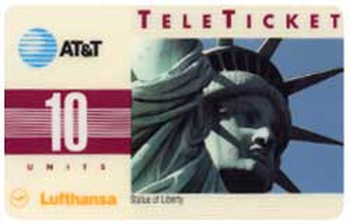 Statue of Liberty image, American icon, with AT&T and Lufthansa branding, 10 units prepaid, marked SAMPLE, blending history, travel, and telecom. |