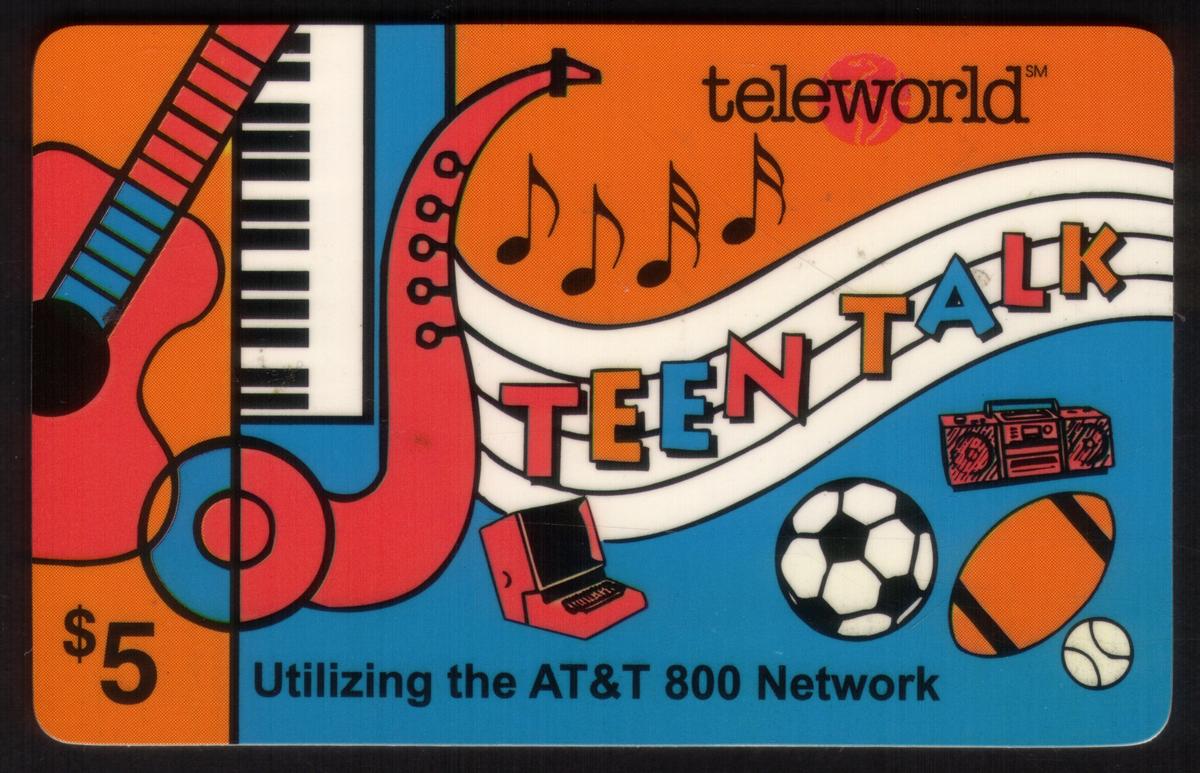 The card is issued by Teleworld International and is part of the “Teen Talk” General Issue series. The denomination on the card is $5, indicating its value within the set. The bright and lively visuals directly connect with young users by representing popular hobbies and entertainment options relevant to their age group. The design incorporates bold, clear colors and a playful arrangement of the different objects.