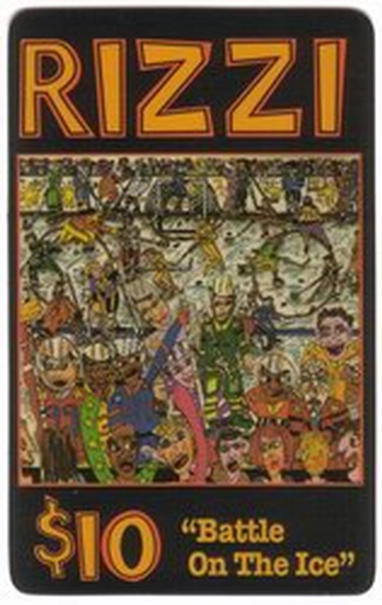 The card belongs to the Teleworld International series and is related to sports, specifically hockey. The front shows dynamic figures with exaggerated facial expressions and vivid uniforms, capturing the excitement and competitive spirit of the game. The name "Rizzi" appears prominently on the card, directly associating the artwork with the artist.
